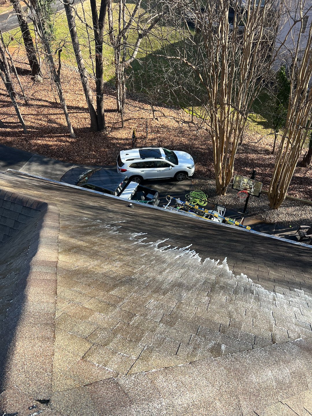 On the roof we used a low pressure roof wash to eliminate years of algae and moss. That method treats the roof with cleaning agents that break down biological growth, and the low pressure helps prevent damage to shingles or other roofing materials. The visible algae and moss were addressed systematically so the roof would be cleaned evenly across all slopes and valleys.